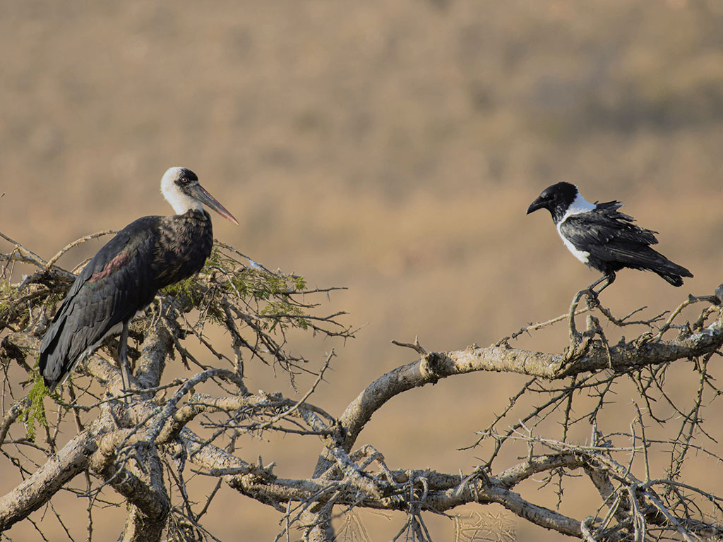 Wooly-necked Stork and Pied Crow